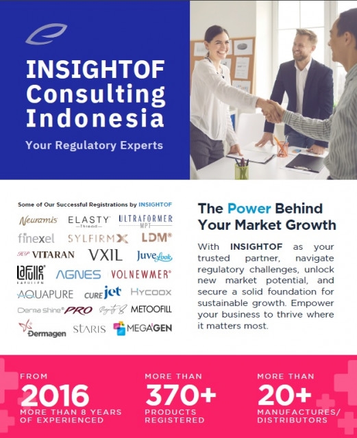 PT INSIGHTOF Consulting Indonesia는 인도네시아 의료기기 및 화장품 허가 서비스 전문 업체로, 2016년부터 20개사 370개 이상의 제품 등록을 성공적으로 수행해온 경험이 있다. 특히 국산 대표 필러 및 미용 의료기기 등록을 다수 진행한 바 있으며, 등록이 까다로운 제품군, 특히 스킨부스터와 같은 혁신적인 제품의 등록에 강점을 갖고 있는 회사로 잘 알려져 있다.